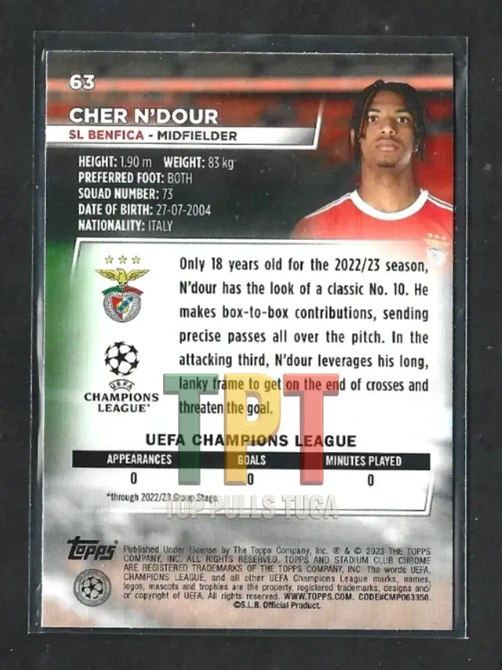 1x2022-23 Topps Stadium Club Chrome UEFA Club Competitions - Blue Prism Refractor #63 - Cher N'dour