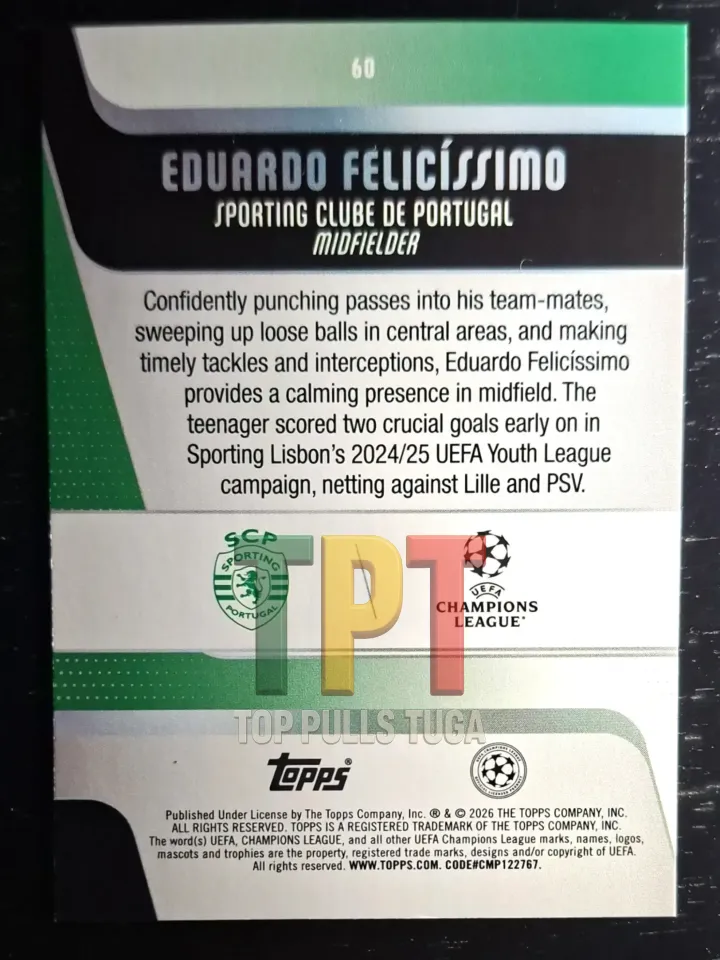 "Distribuindo passes com confiança para seus companheiros de equipe, recuperando bolas soltas em áreas centrais e fazendo desarmes e interceptações oportunas, Eduardo Felicissimo oferece uma presença tranquilizadora no meio-campo. O adolescente marcou dois gols cruciais no início da campanha da UEFA Youth League 2024/25 do Sporting Lisboa, contra Lille e PSV."