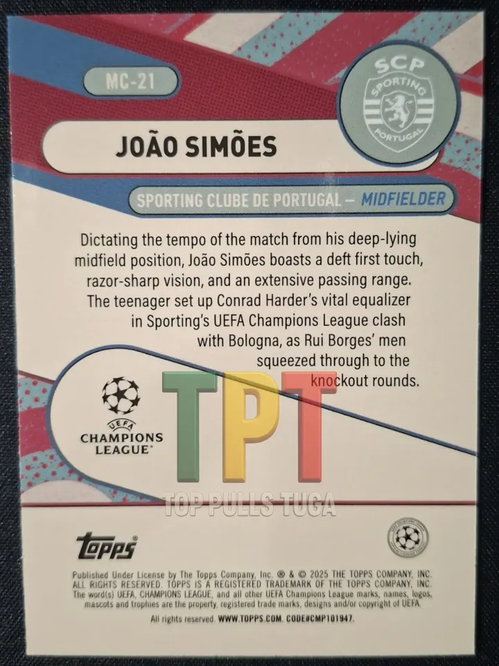 "Ditando o ritmo do jogo a partir de sua posição de meio-campo recuado, João Simões possui um toque inicial hábil, visão aguçada e um amplo alcance de passe. O adolescente preparou o gol de empate vital de Conrad Harder no confronto da Liga dos Campeões da UEFA do Sporting com o Bologna, enquanto os homens de Rui Borges avançaram para as fases eliminatórias."