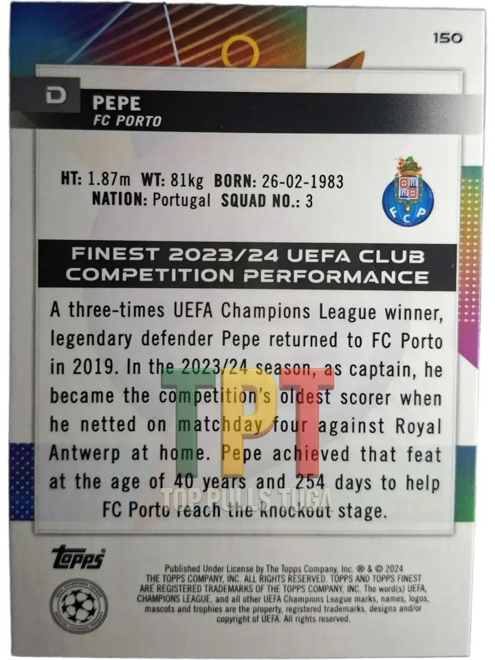 "Vencedor da Liga dos Campeões da UEFA por três vezes, o lendário defesa Pepe regressou ao FC Porto em 2019. Na temporada 2023/24, como capitão, tornou-se o marcador mais velho da competição ao marcar no quarto dia de jogo contra o Royal Antwerp em casa. Pepe alcançou esse feito com 40 anos e 254 dias para ajudar o FC Porto a chegar à fase de eliminatórias."