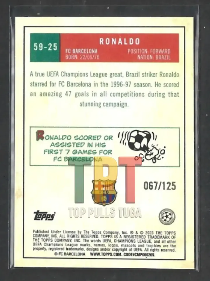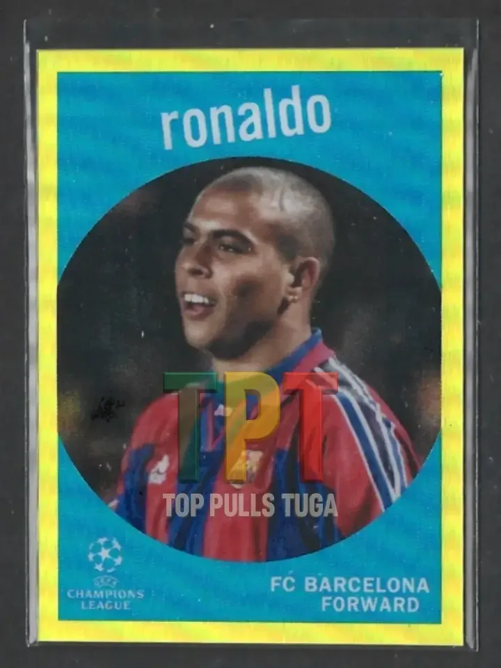 "Um verdadeiro grande da UEFA Champions League, o avançado brasileiro Ronaldo brilhou pelo FC Barcelona na temporada de 1996-97. Ele marcou impressionantes 47 golos em todas as competições durante essa campanha deslumbrante."