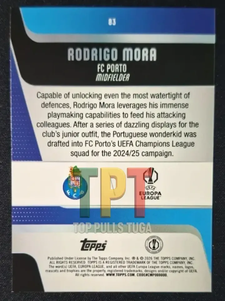 "Capable of unlocking even the most watertight of defences, Rodrigo Mora leverages his immense playmaking capabilities to feed his attacking colleagues. After a series of dazzling displays for the club's junior outfit, the Portuguese wonderkid was drafted into FC Porto’s UEFA Champions League squad for the 2024/25 campaign."